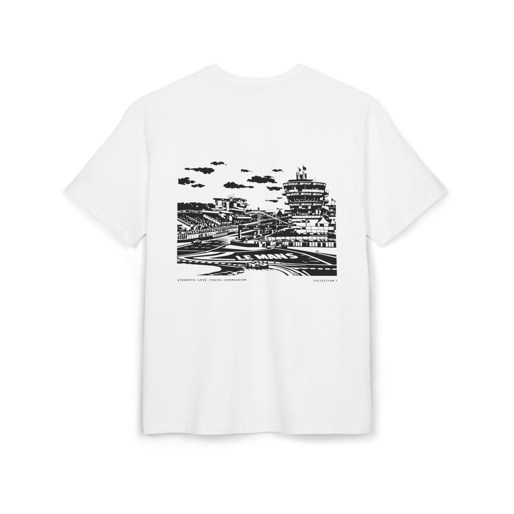 White tee with a nostalgic Le Mans–inspired back graphic that pays tribute to the golden era of endurance racing — timeless style for true motorsport enthusiasts.